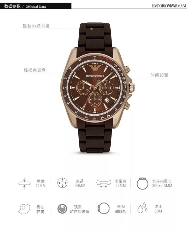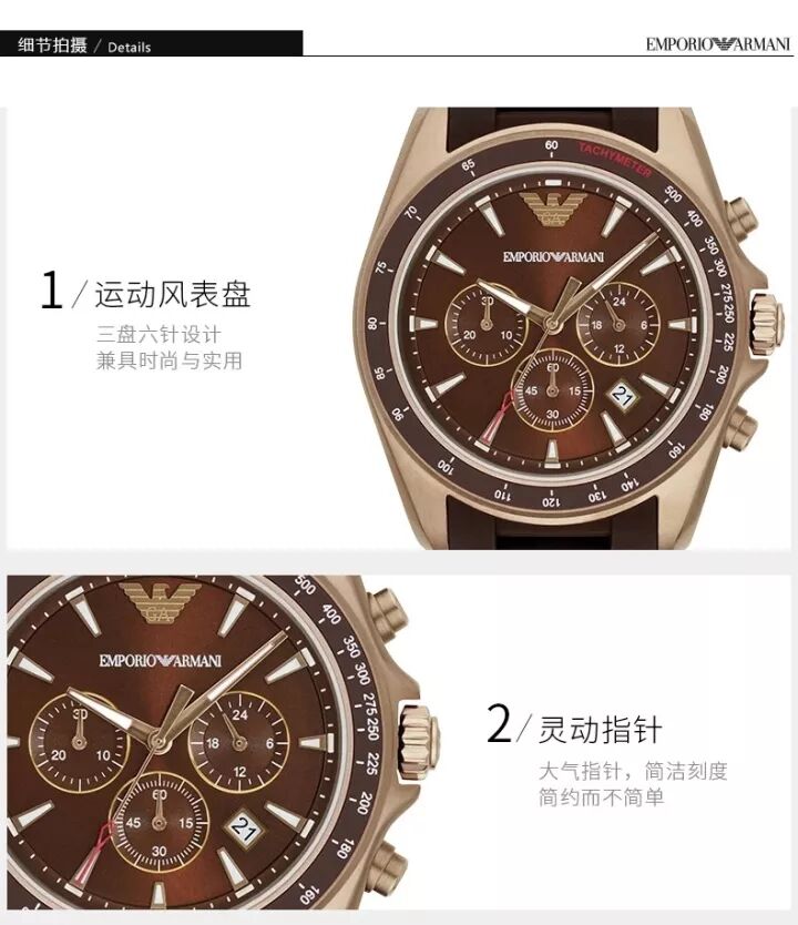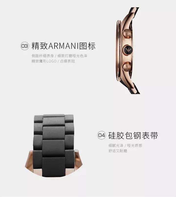 阿玛尼手表以其时髦缤纷的色彩,活泼的设计以及颠覆传统的造型,滴答地随着摩登生活的节奏向前迈进。在阿玛尼之前,没有任何流行品牌获得这样的成就:在极短的时间内,占据全球爱好者的心,地位屹立不摇;除了维持既有的版图,同时还持续向其它领域延伸度发展。阿玛尼成功的原因并不是秘密:阿玛尼不只是报时的手表。阿玛尼品牌定位于时尚的、奢华的、动感的、艺术的……用激情去创造。