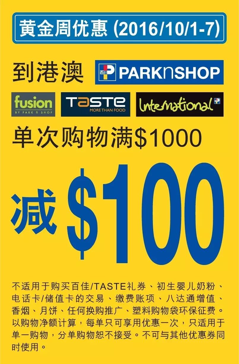 10月1至7日期間,凭中国屈臣氏会员卡去港澳百佳旗下店铺、TASTE买满港币1000享港币100折扣,详情请参阅港澳百佳网站。