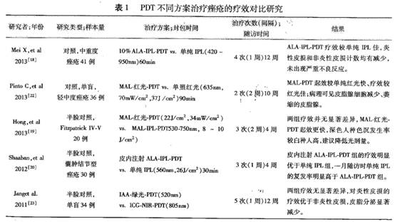 人们很早就发现日晒能够在一定程度上改善痤疮。在半个多世纪以前,曾经走过一段用紫外线照射治疗痤疮的弯路,终因缺乏疗效和潜在的致癌风险而遭摒弃。在第一例光动力疗法成功治疗基底细胞癌的病例报告问世后的整整10年,2000 年,Hongcharu等首次报道了20%的ALA联合红光能安全且有效地治疗成人背部痤疮。从此,痤疮的物理治疗翻开了新的篇章。经过十多年的发展与探索,光动力治疗痤疮的临床方案日益繁多,从光敏剂的选择、浓度、敷药时间、光源选择、光剂量等都有所不同,由于参数变量多,目前仍缺乏系统性的大规模的临床对照研究,最优方案尚无定论(见表1)。
