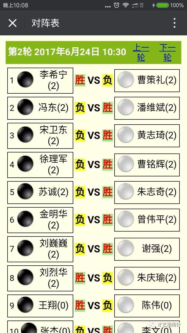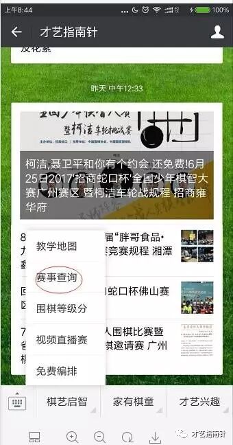 查询入口:公众号“才艺指南针”的自定义菜单“棋艺启智”中的“赛事查询”,选择赛事,再选择组别,进行自主查询。对阵表暂时没有实时同步更新。