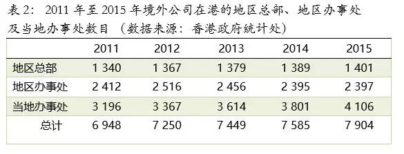我们先看香港是如何支撑跨国企业全球化发展的。2015年,香港境外母公司在香港设立的地区总部、地区办事处及当地办事处一共7904个(见表2),雇佣员工42万多人。这是一个庞大的所谓总部经济。香港政府对此相当重视,每年都针对这些公司做问卷调查。调查除了关注这些公司的主要活动内容,服务对象,更是收集他们对香港看法的一个重要途径。