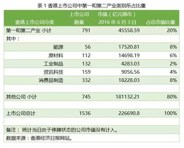 无独有偶,我们看到,近年来越来越多香港的上市公司不是属于制造业,而是各种其他消费行业和服务行业。也就是说,作为香港最主要支柱的金融服务业,其直接服务的对象,也主要不是生产制造业(见表1)。这些数据和前面提到的贸易与运输的数据一起说明,香港已从一个主要服务于生产网络的枢纽变成了全球消费网络上的枢纽。