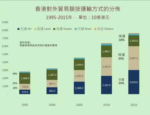 瞬间二十年,东莞打个喷嚏全世界就感冒的时代已一去不返。珠三角与香港这个曾经的世界第一大集装箱港之间的集装箱量只占目前该港口总吞吐量的四成。葵青港已经成了为班轮公司服务的中转服务港,中转量已达七成。从贸易额角度看,会发现,对香港而言,更重要的是空港。下图显示,香港商品对外贸易总额的四成是航空运输完成的,海运河运加起来才占两成。我分析过的更详细的数据显示,陆运与空运高度相关,而不是海运。也就是说,香港经济四大经济支柱行业中的两个,物流与贸易,越来越多地以提供高货值最终消费品相关服务为生。因此,我一直强调,香港赤腊角国际机场是香港经济的咽喉。