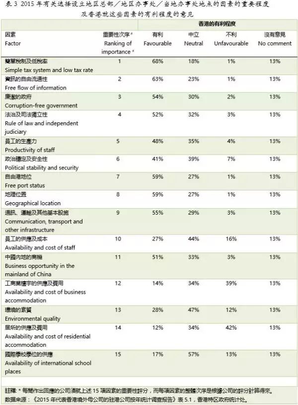 从这份香港的总部和办事处对十五个因素的评价看,前9项都是选择香港的压倒性原因,特别是前四项,即(1)简单税制和低税率(2)资讯的自由流通性(3)廉洁的政府(4)法治及司法独立性。被评为不利条件的两项,是(12)工商业楼宇的供应及费用和 (14) 居所的供应和费用,反映出我第一篇中提及的问题,高地价其实是隐性税务。