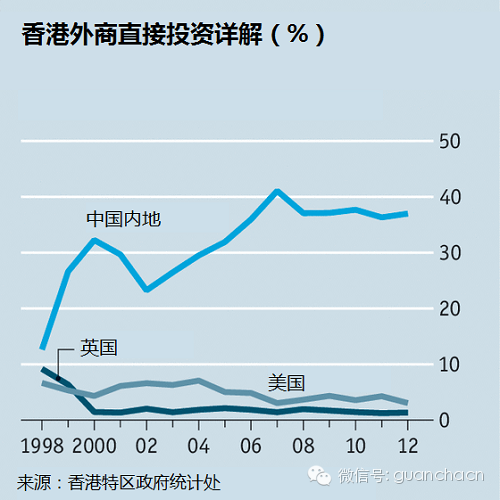 然而,随着时间的推移,香港经济已被逐渐吸引到中国的轨道上来,其最明显的标志便是大量的现金和游客从内地涌入香港。内地投资占香港外商直接投资总额的份额从上世纪90年代末不足1/10,上升到今天将近2/5(见图表1)。如果计入在英属维尔京群岛和开曼群岛注册的内地企业,这个比重甚至会更高。地产咨询公司世邦魏理仕指出,在香港主要商业区的高端写字楼,内地企业入驻率从2008年的12%上升至去年的19%。