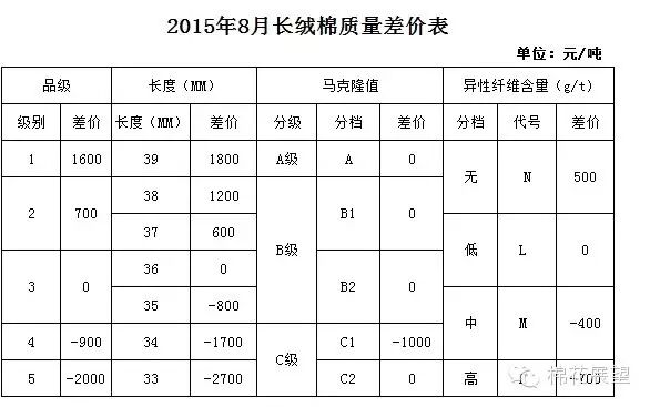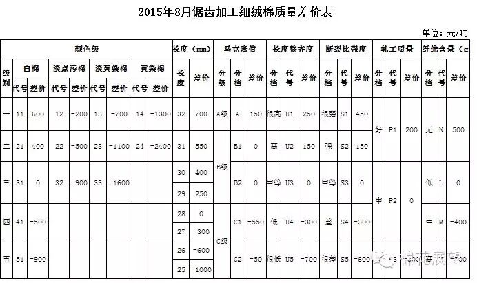 根据《中国棉花协会国产棉质量差价表定期发布办法》的规定,现正式发布2015年8月《锯齿加工细绒棉质量差价表》、《皮辊加工细绒棉质量差价表》和《长绒棉质量差价表》。 为方便储备棉轮出结算,2015年8月《中国棉花质量差价表》保持不变,各指标价差幅度维持7月份水平。