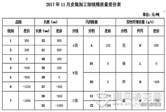 依据2017年10月的棉花公检质量数据、质量价差自动生成信息平台采集的棉花加工企业销售成交价、纺织企业监测点的采集数据以及当月的中国棉花价格指数,并征求行业内有关专家的意见,现对2017年11月《锯齿加工细绒棉质量差价表》和《皮辊加工细绒棉质量差价表》做出如下调整(单位:元/吨):