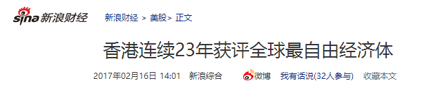 香港连续第23年被美国传统基金会(Heritage Foundation)评为全球最自由经济体,得分较去年有所上升,较排名第二的新加坡领先幅度进一步拉大。