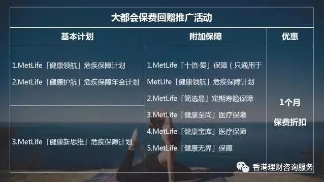 于推广期内,客户成功投保大都会人寿的以下基本计划/基本计划连同附加保障,可享一个月保费折扣优惠。