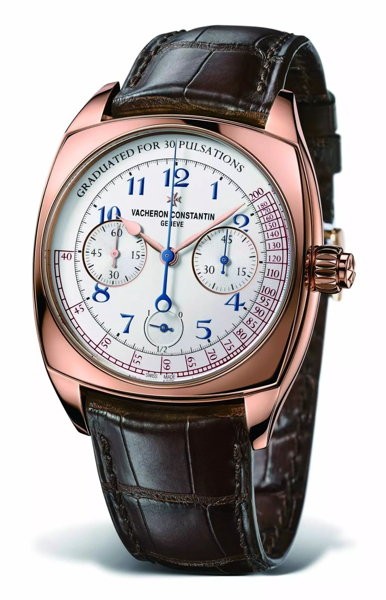 操作方式:如果腕表盘面显示“30 PULSATIONS”,则意味该腕表脉搏计的测定校准为30下脉搏。启动计时按钮,当脉搏跳动30下后立刻掣停码表,此时计时秒针所指数字即为一分钟平均心跳,例如脉搏跳动30下,秒针停在5点钟位置,对照脉博计70,此数字即为被测者心跳频率。