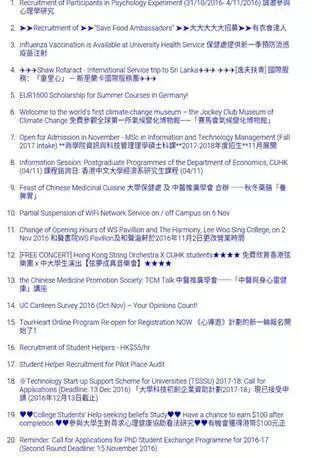 在中大,学生每天都会收到学校发送到手机上的邮件,介绍当天的校园活动, 每天都有无数条项目活动等着大家参与,学生生活非常丰富。这些活动都是各个学院、书院的同学自己办理,整个中大学生让人感觉非常有精气神、有朝气。在星期一到星期五的时候,整个学校生机勃勃,会有一种燃烧青春的感觉。我在中大的一年里就参加了很多类似圆桌酒会、高桌晚宴、弦乐队、音乐会、昆区表演之类的活动,在APP上点下注册就可以领到票,参与非常方便。