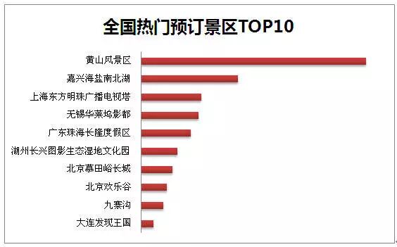 驴妈妈数据显示,当前黄山风景区、嘉兴海盐南北湖、上海东方明珠广播电视塔、无锡华莱坞影都、广东珠海长隆度假区、湖州长兴图影生态湿地文化园、北京慕田峪长城、北京欢乐谷、九寨沟、大连发现王国位列全国热门预订景区TOP10。