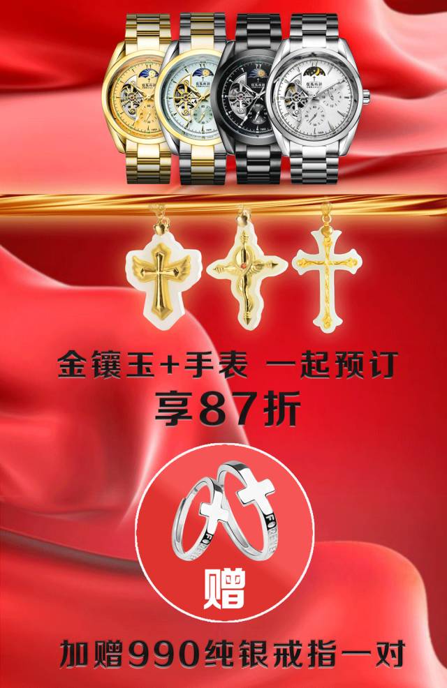 【珍珠金镶玉十架项链】+【神创全自动机械表】一起定制,享受8.7折优惠!主内七夕活动期间,还加赠990纯银十架戒指一对(2枚)!非常合适的活动,请弟兄姊妹们抓紧时间,优惠错过就没有了!