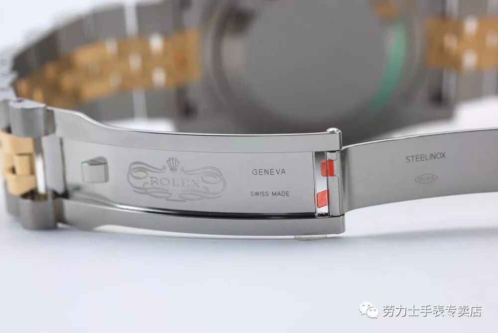 同样刻有劳力士标识的折叠表扣边缘光润,精钢材质更耐用,折叠表扣更方便佩戴。