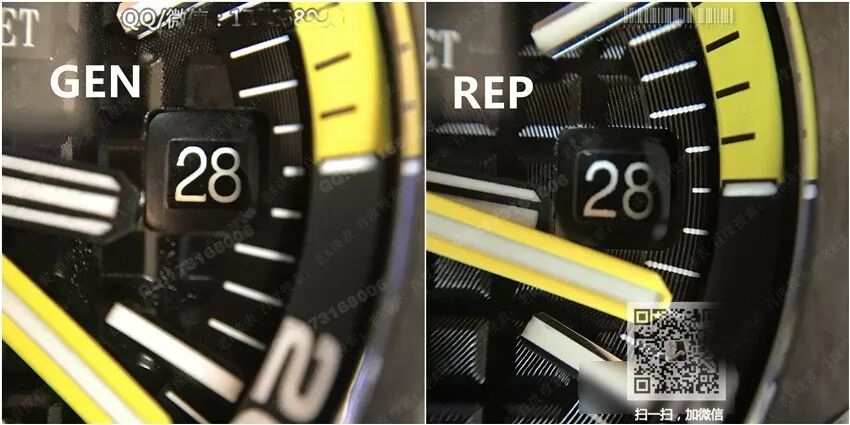 男士机械表:放大后老五惊讶地发现正品分针的头部竟然如此粗糙。复刻版字面字体的印刷比起正品略细一些。字面的纹路有少许差异,但是这都是放大后能看到的效果,日历字体和正品几乎没什么不同,唯一区别就是字体边缘比正品要粗糙一些。看到这里可能有的表友就会觉得复刻版做得很棒也有人会吐槽做工粗糙,不过玩仿表最重要就是心态,毕竟正品十多万复刻只有两三千。而且这些都是放大10倍的效果,平常肉眼是难以察觉的。