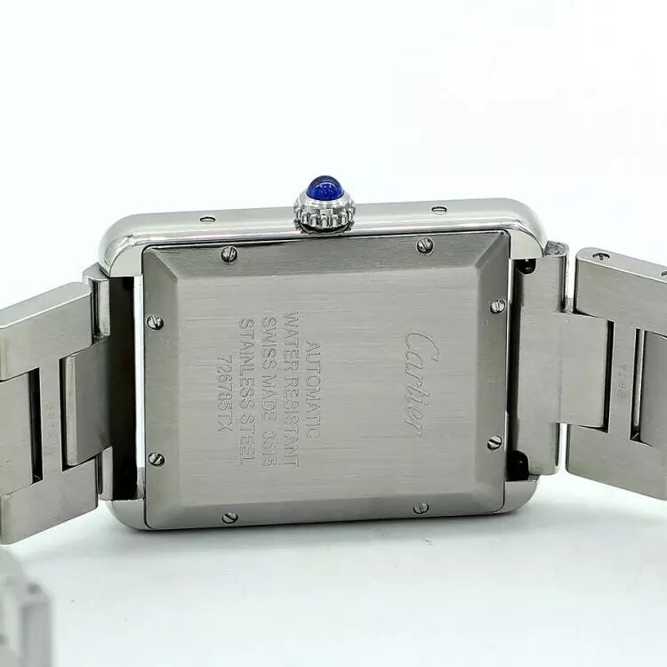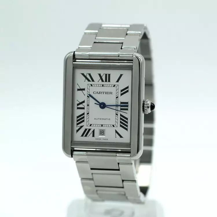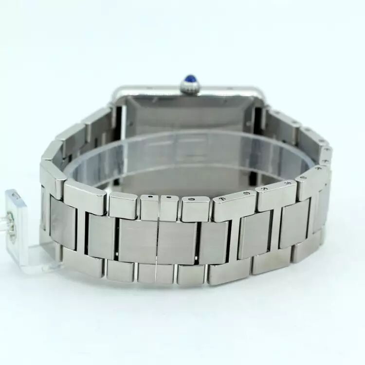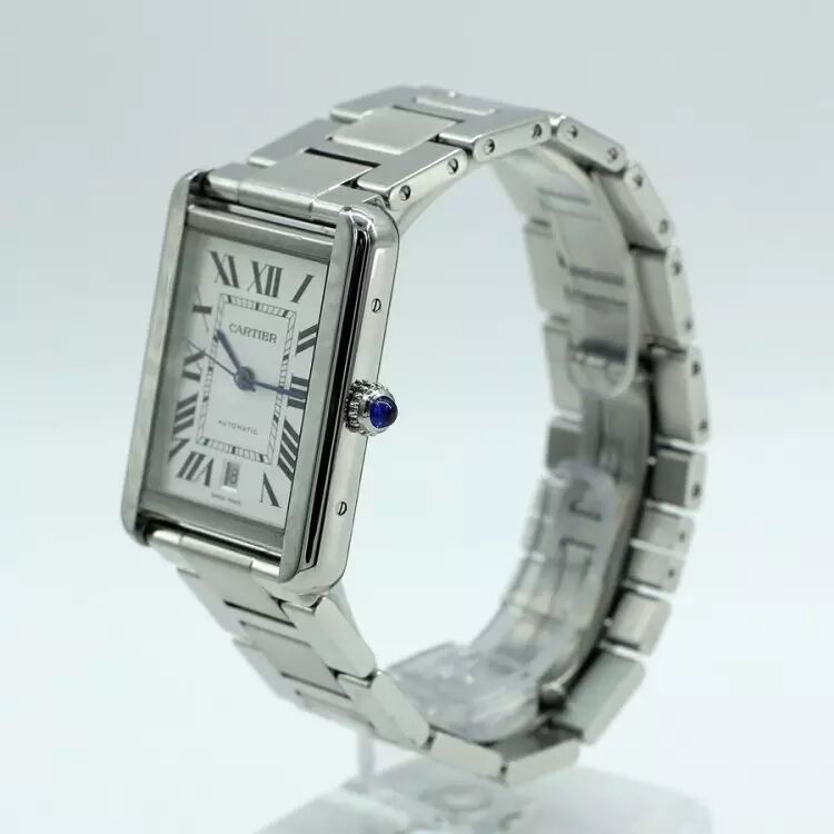 Cartier卡地亚超大号钢款TANK SOLO白盘机械中性腕表。型号:W5200028,简洁低调的现代设计,Tank Solo腕表自诞生之日便成为了经典。整表精钢打造,31x40.85MM表径,超大号款,男女都合适。镀银珠光表盘,剑形蓝钢指针,经典大罗马字刻度,蓝宝石水晶镜面,表把镶嵌一颗蓝色宝石。搭载卡地亚自动机械机芯,干练、精准。6点位置日历窗口显示,结实耐用的精钢表链,方便的折叠表扣。表链:13节(不区分大小节),腕周:20CM左右,