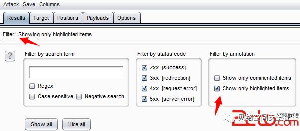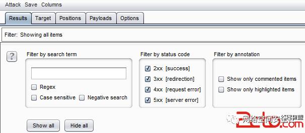 Search term(检索词) - [专业版]您可以筛选反应是否不包含指定的搜索词。您可以设定搜索词是否是一个文字字符串或正则表达式,以及是否区分大小写。如果您选择了“negative search(消极搜索)”选项,然后不匹配的搜索词唯一的项目将被显示。 Status code(状态代码) - 您可以配置是否要显示或隐藏各种HTTP状态码响应。 Annotation(注释) - 您可以设定是否显示使用用户提供的评论或只重点项目。在结果表中显示的内容实际上是一个视图到基础数据库,并显示过滤器控制什么是包含在该视图。如果设置一个过滤器,隐藏一些项目,这些都没有被删除,只是隐藏起来,如果你取消设置相关的过滤器将再次出现。这意味着您可以使用筛选器来帮助您系统地研究一个大的结果集(例如,从模糊测试包含许多参数的要求)来理解各种不同的有趣的响应出现。
