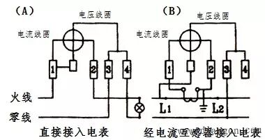 单相电表的接线相对简单明了。在低电压小电流线路中,电表可直接接在线路上,如图(A)所示。电表端盖(即图中标有1、2、3、4的那一排方框)都画有接线图,对于低电压大电流中的线路中,电表电流线圈经电流互感器与负载相连,如图(B)所示。国产DD862系列单相电表。 ![单相电表接线图详解]()
