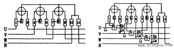 上图(左)为三相四线有功电表直接接入,火线U、V、W分别接在1、4、7端,3、6、9端接负载,零线接10号端,11号端接负载另一端。 ![三相四线电表接线图]()