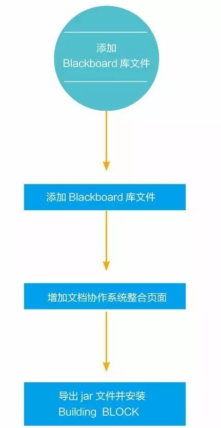 Blackboard整合私有云文档协作系统流程如图4所示,首先在系统中增加了Blackboard基础库文件(bb-cms-admin.jar,bb-platform.jar和bb-taglibs.jar等)。随后配置bb-manifest.xml,该文件是Building block的描述文件,配置接入的文档协作系统名称、整合页面文件索引、组件类型等信息。在整合页面中,我们添加了文件同步等功能,方便用户操作。最后需导出该整合项目的jar包,由系统管理员在管理页面中完成该jar包的安装。