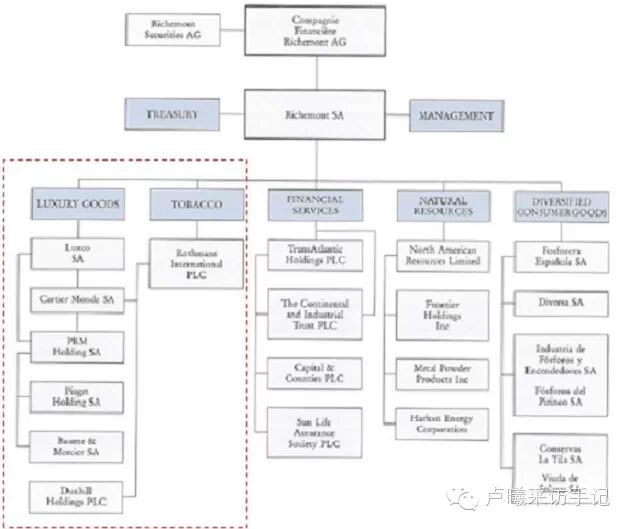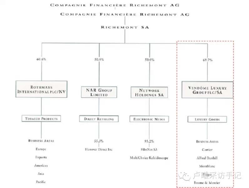 奢侈品业务构架混乱。历峰直接持有卡地亚的股份;通过卡地亚持有伯爵和名仕;还通过乐富门烟草间接持有卡地亚股份以及登喜路公司——包括登喜路及其持有的万宝龙和蔻依。
