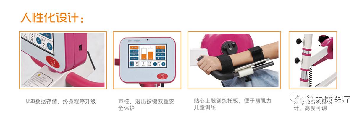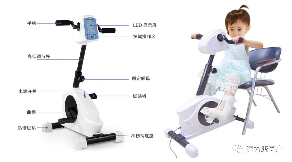 用途:在设备运转过程中随时检测患者的上下肢关节和肌肉的疲劳状态通过改变运行方式加以缓解;具有主动康复训练功能,主动康复训练时有2Nm的阻力,在使用过程中具有20~30分钟停机和提醒功能:运动中心高度可调;电脑通过传感器判断出患者的屈张力或伸张力过大时,在LED显示屏上显示抗阻信息,改变曲柄运转方向,将伸张运动改变成屈曲运动或将屈曲运动改变成伸张运动,从而起到痉挛保护的作用;适用范围:适应身高0.8m-1.5m(年龄3岁-13岁)的脑瘫、截瘫儿童使用。