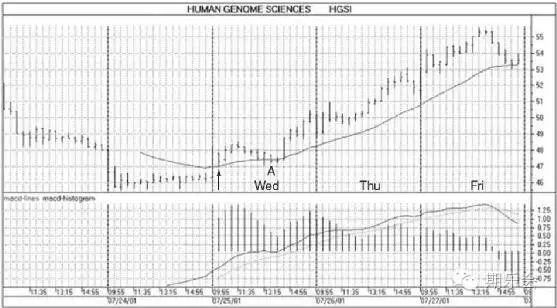 周三开盘时有强烈的买入信号,均线上涨,MACD柱的上涨也确认了。当均线上涨时,它告诉我们要做多人类基因科学,三重滤网的第一重滤网看涨。这个信号比MACD柱的任何上涨或下跌都重要。当MACD和均线同时上涨,它建议仓位要大,但是当它下跌时,它只是完美的正常的“喘气”,因为此时并没有看跌背离。