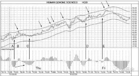 在通道线附近兑现利润。如果你在均线附近买入,在通道上线附近卖出。如果你的5分钟振荡指标,比如MACD柱创造了新高,且相关市场在上涨,你可以等待通道被碰到或穿过。如果指标弱,不用等到价格碰到通道就止损。